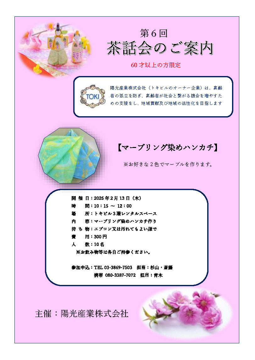 陽光産業株式会社(トキビルのオーナー企業)は高齢者の孤立を防ぎ、高齢者が社会と繋がる機会を増やすための支援をし、地域貢献及び地域の活性化を目指します。