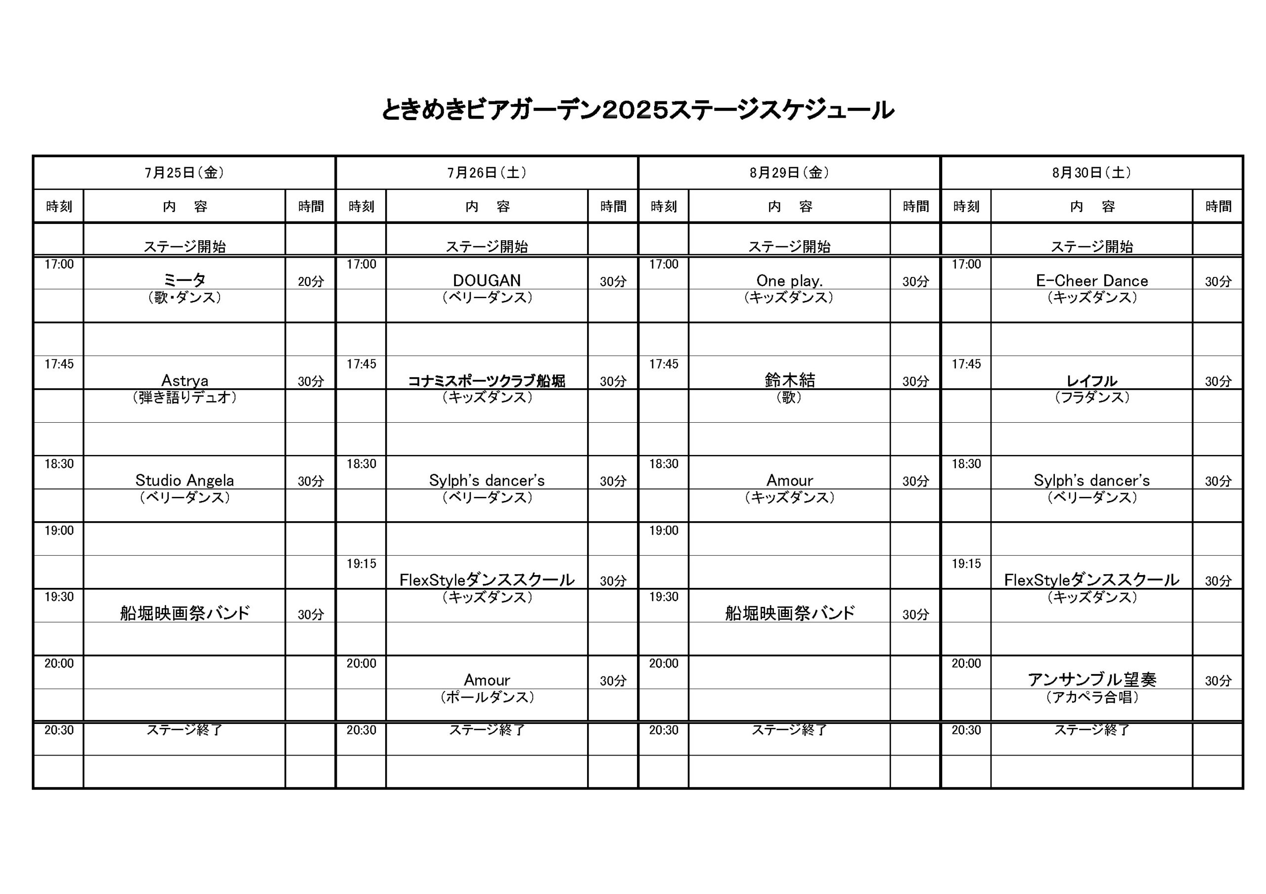 『ときめきビアガーデン2025』のステージスケジュールをお知らせいたします。 ビアガーデンの開催時間は各日17時~22時となります。 天候悪化により中止、変更となる場合があります。 カテゴリー: TOKIビルニュース2025年7月9日タグ: TOKIビルイベントビアガーデンステージ Share this post Facebook で共有Facebook で共有 Share on XX で共有 ピンするPinterest で共有 WhatsApp で共有WhatsApp で共有 LinkedIn で共有LinkedIn で共有 投稿ナビゲーション前へ前の投稿:今年もやります!ビアガーデン次へ次の投稿:忘新年会宴会を更新いたしました!関連記事 『こころの森クリニック』開院2025年10月28日11月12日(水)マルシェ開催!2025年10月23日今年もやります!ビアガーデン2025年6月23日