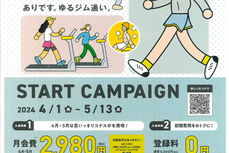 過ごしやすい季節となりました!このタイミングで運動習慣を身に付けませんか?! 只今入会キャンペーンを実施中です。4月5月の月会費がなんと!! 「2,980円」で全国の施設を使い放題!お得にはじめられるチャンスです。 コナ…
