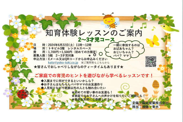 【知育体験レッスンのご案内】 6月22日(土)2~3才児コース 6月23日(日)入学準備コース ★あそぶことから学ぶ★ ・あそぶ子どもたちは、“小さな科学者” である。 ・子ども自身が体験しなければ学ぶこと…