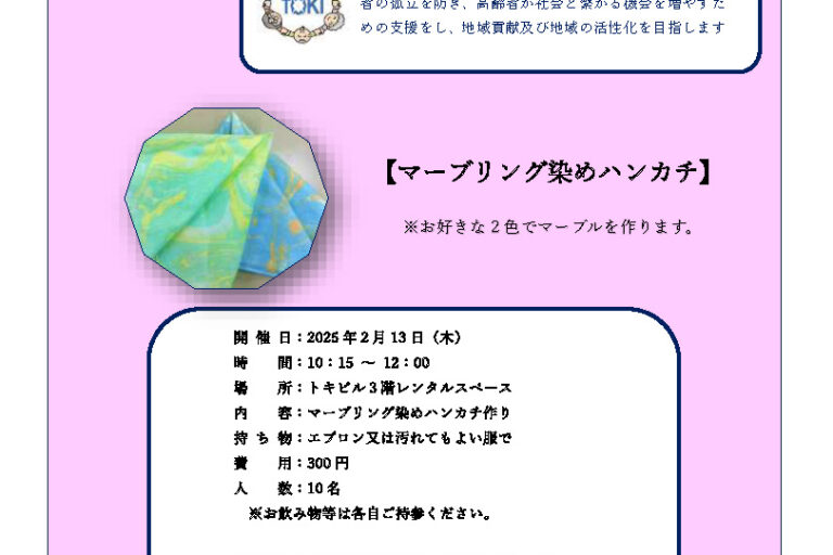 陽光産業株式会社(トキビルのオーナー企業)は高齢者の孤立を防ぎ、高齢者が社会と繋がる機会を増やすための支援をし、地域貢献及び地域の活性化を目指します。 2月【マーブリング染めハンカチ】 日 時:2025年2月13日…
