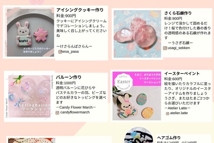令和5年3月18日(土) 10~15時 2階 けさらんぱさらん内にて 「春のキッズ 船堀deワークショップ」開催します。 (ワークショップ) ・アイシングクッキー作り ・さくら石鹸作り ・バルーン作り ・イースターイベン…