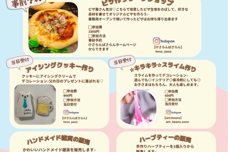 5月262023 ショップニュースF2-07 けさらんぱさらん 2023.6.11 けさぱさマルシェ ショップニュース, F2-07 けさらんぱさらんtokibiruから2023年5月26日 6月11日(日)11~15時 けさぱさマルシェ開催します!! キッズと親子で楽しめる内容のマルシェです。 *「ピザ作りワークショップ」(事前予約有り) こちらで用意したピザ生地を伸ばして、好きな具材をのえてオリジナ… 続きを読む