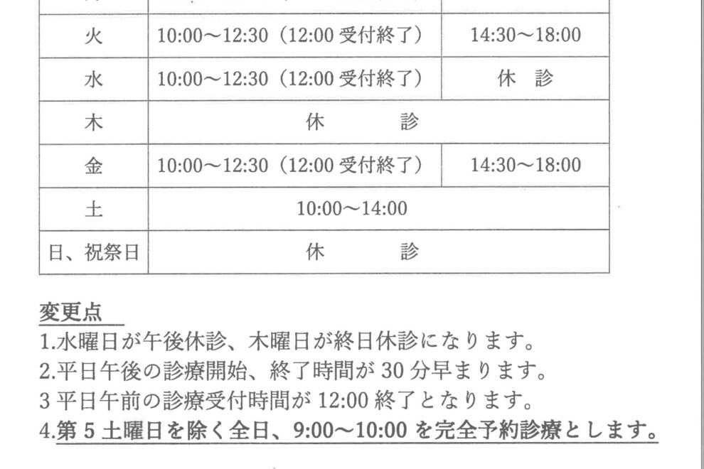 | 営業時間 | 月・火・金:10:00~12:30(12:00 受付終了) /14:30~18:00 水:10:00~12:30(12:00 受付終了) 土:10:00~14:00 |
