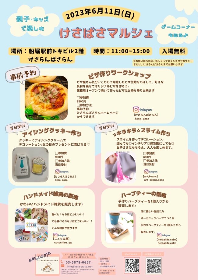 6月11日(日)11~15時 けさぱさマルシェ開催します!! キッズと親子で楽しめる内容のマルシェです。 *「ピザ作りワークショップ」(事前予約有り)    こちらで用意したピザ生地を伸ばして、好きな具材をのえてオリジナ…