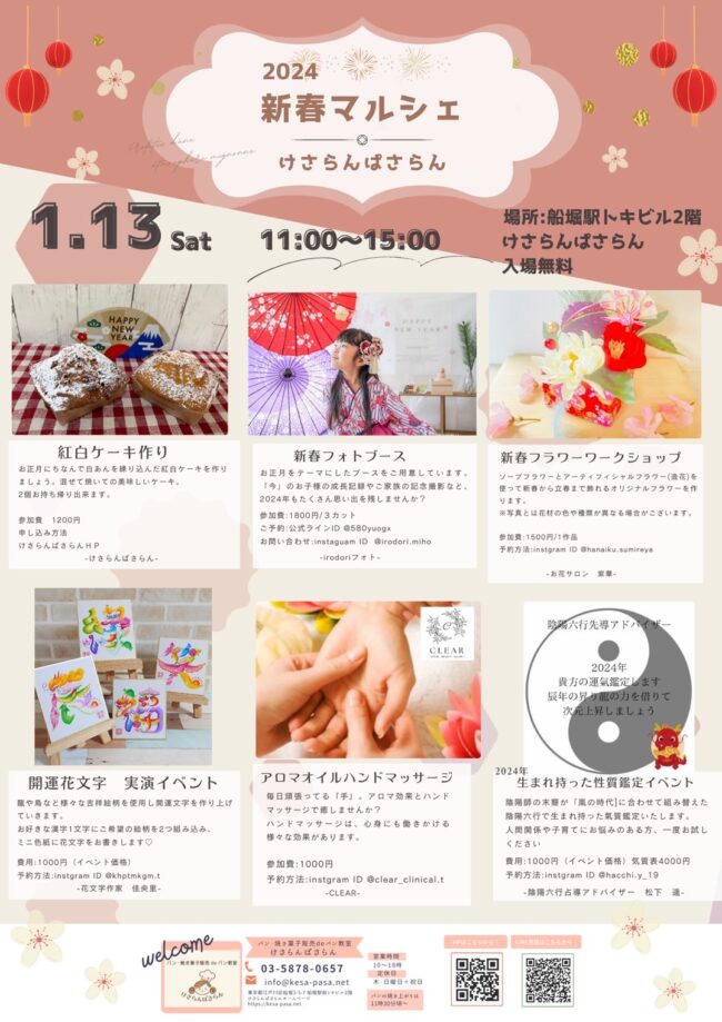 トキビル2階 けさらんぱさらんです。新しい1年のスタートにぴったりの大人も子どもも楽しめるマルシェをご用意しました。・ワークショップ ★紅白ケ―キ作り ★新春フラワーワーク・開運花文字実演イベント ・生まれ持った性質鑑定…