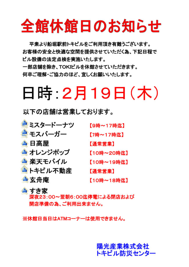 ビル休館日には法定点検や年次保守作業、設備工事等のため、お店は一部を除いて休業となります。 お客様用入口は閉鎖…