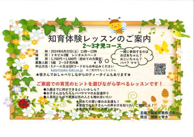 【知育体験レッスンのご案内】 6月22日(土)2~3才児コース 6月23日(日)入学準備コース   ★あそぶことから学ぶ★ ・あそぶ子どもたちは、“小さな科学者” である。 ・子ども自身が体験しなければ学ぶこと…