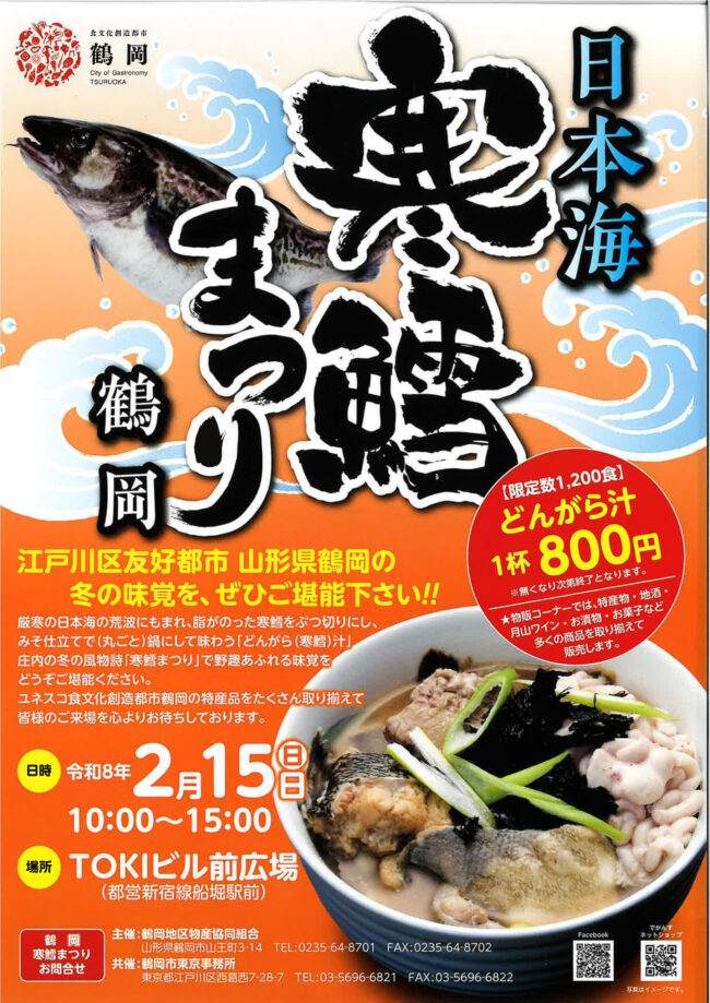 山形県鶴岡市主催の『寒鱈まつり』が今年もTOKIビル前にて開催されます。 戦時中に江戸川区の学童が疎開した山形…