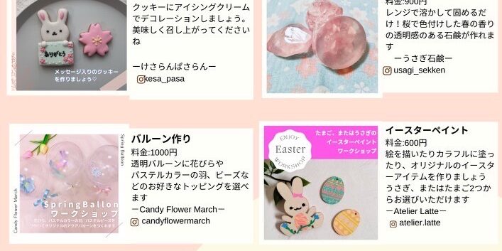 令和5年3月18日(土) 10~15時 2階 けさらんぱさらん内にて 「春のキッズ 船堀deワークショップ」開催します。 (ワークショップ) ・アイシングクッキー作り ・さくら石鹸作り ・バルーン作り ・イースターイベン…