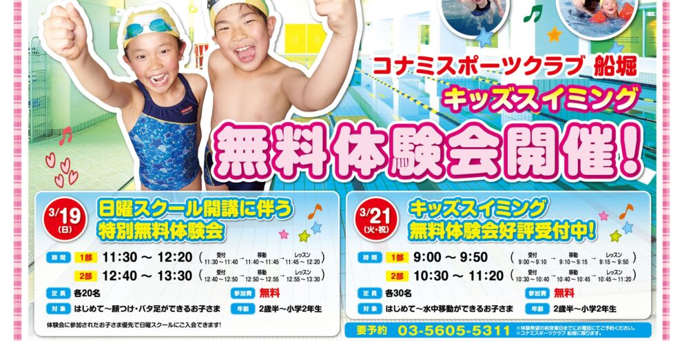 ◆3月19日(日)◆ 1部 11:30~ / 2部 12:40~ 定員:各20名 対象:はじめて~ 年齢:2歳半~小学2年生 ※3/19の体験会に参加されたお子様は、日曜日に新規開講するスクールに優先的に入会できます。…