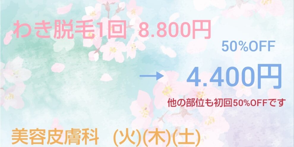 🌸 春のキャンペーン 🌸 医療レーザー脱毛 初回 50%OFF !! わき脱毛 1回 8,800円 50%OFF → 4,400円 V.I.Oライン脱毛 1回26,400円 50%OFF → 13,200円 腕や脚など他…