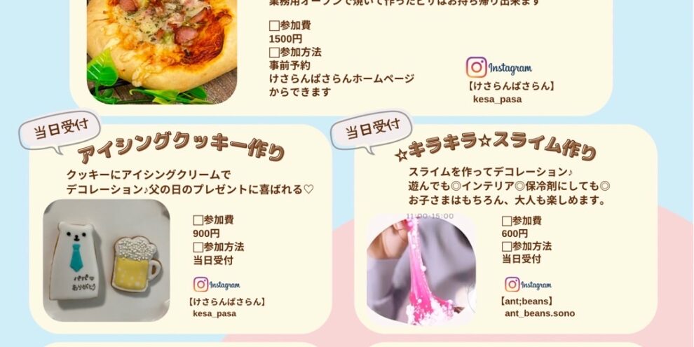 6月11日(日)11~15時 けさぱさマルシェ開催します!! キッズと親子で楽しめる内容のマルシェです。 *「ピザ作りワークショップ」(事前予約有り) こちらで用意したピザ生地を伸ばして、好きな具材をのえてオリジナ…