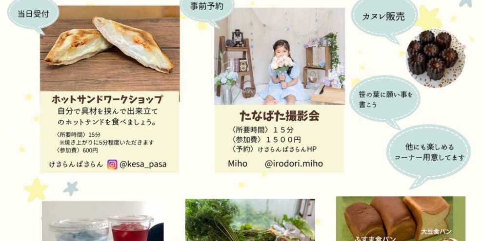 2023.7.2(土) 11~15時 トキビル2階 けさらんぱさらんにて「たなばたフーズマルシェ」を開催します。 メニュー★ワークショップ ホットサンドを作ろう!★たなばた撮影会(事前予約有り)を★ハーブティー販売★野菜…