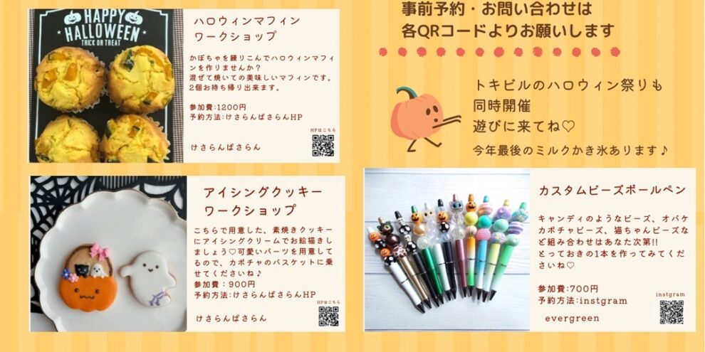 令和5年10月29日(日)11~15時 トキビル2階 けさらんぱさらんにて ハロウィン けさぱさ キッズワークショップを開催します。 ■参加ワークショップ■ ★ハロウィンマフィン @けさらんぱさらん ★アイ…