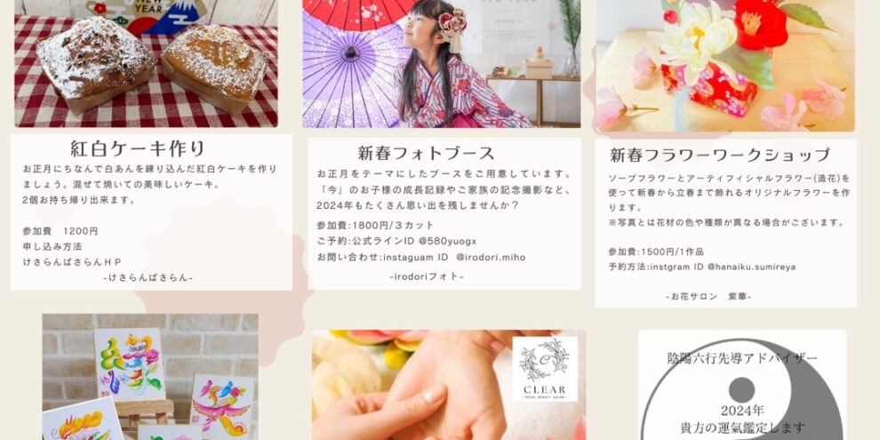 トキビル2階 けさらんぱさらんです。新しい1年のスタートにぴったりの大人も子どもも楽しめるマルシェをご用意しました。・ワークショップ ★紅白ケ―キ作り ★新春フラワーワーク・開運花文字実演イベント ・生まれ持った性質鑑定…