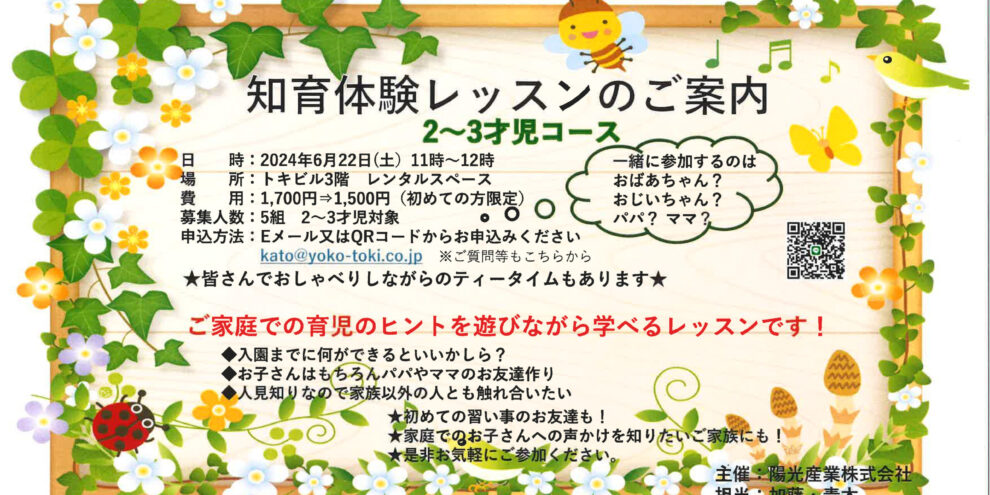 【知育体験レッスンのご案内】 6月22日(土)2~3才児コース 6月23日(日)入学準備コース ★あそぶことから学ぶ★ ・あそぶ子どもたちは、“小さな科学者” である。 ・子ども自身が体験しなければ学ぶこと…