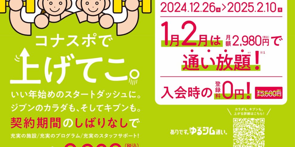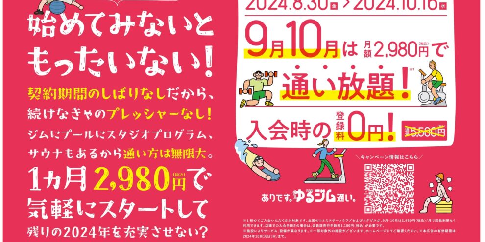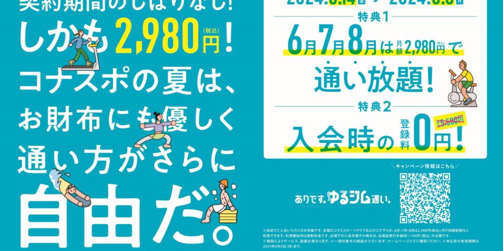 お得な夏のキャンペーンが始まりました! 「コナスポの夏は自由だ。契約期間のしばりなし!しかも2,980円!」 【期 間】 2024年6月14日(金)~8月5日(月) 6月7月8月は月額2,980円(税込)で通い放題! 入…