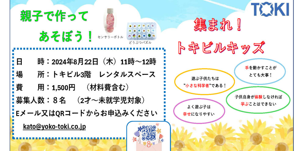 親子で作って遊ぼう!! 今回は「どうぶつパズル」と「センサリーボトル」を作ります。 日 時:2024年8月22日(木)11時~12時 場 所:トキビル3階 レンタルスペース 費 用:1,500円(材料費含む) …