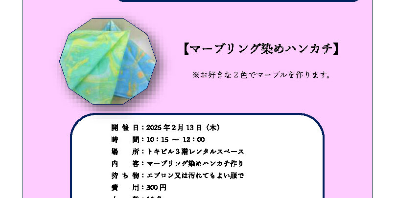 陽光産業株式会社(トキビルのオーナー企業)は高齢者の孤立を防ぎ、高齢者が社会と繋がる機会を増やすための支援をし、地域貢献及び地域の活性化を目指します。 2月【マーブリング染めハンカチ】 日 時:2025年2月13日…