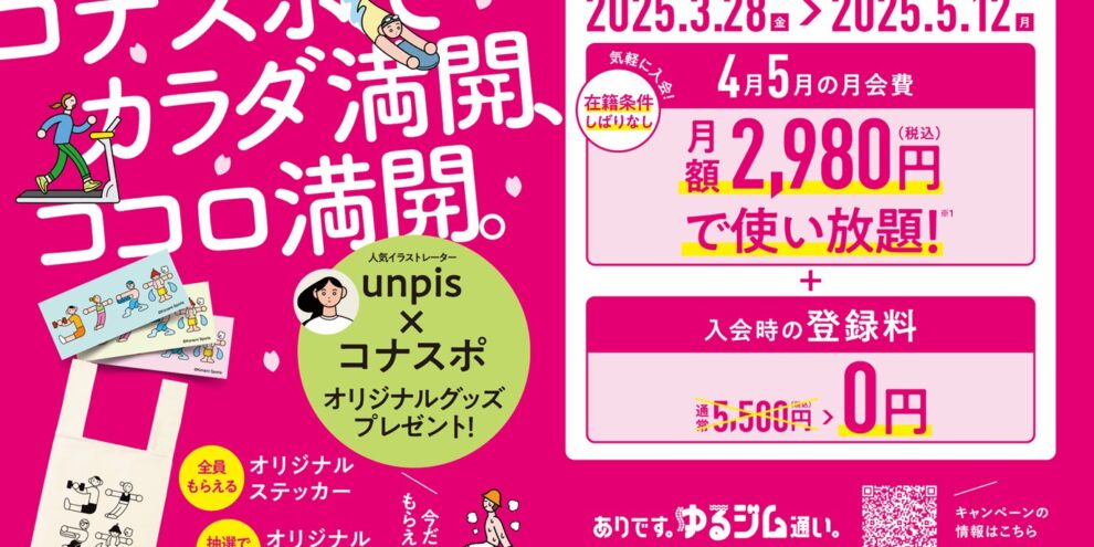過ごしやすい季節となりました!このタイミングで運動習慣を身に付けませんか?! 只今入会キャンペーンを実施中です。4月5月の月会費がなんと!! 「2,980円」で全国の施設を使い放題!お得にはじめられるチャンスです。 コナ…