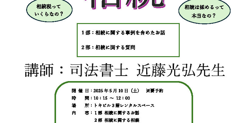 1部では相続に関する事例を含めたお話 2部では相続に関する質問 司法書士の近藤光弘先生に講師をお願いしております。 令和6年4月1日から不動産の相続登記が義務化されました。 スムーズな相続登記が行えるよう、皆様のご参加を…