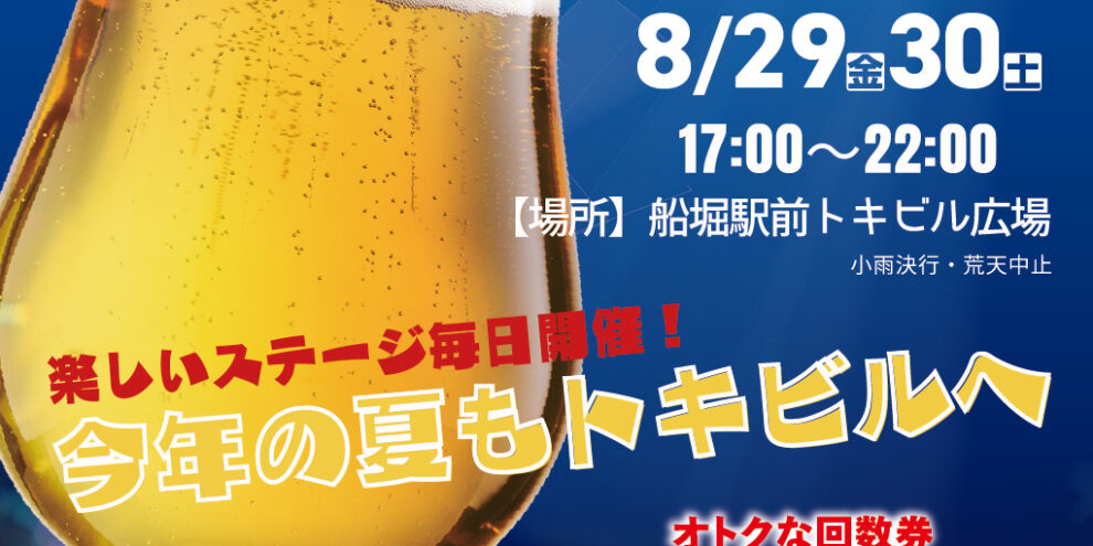 船堀の夏の風物詩『ときめきビアガーデン』を今年もトキビル前広場にて開催予定です。 トキビルのテナントによる、グルメやゲーム・くじ引きなどの屋台が盛りだくさん。 楽しいステージも毎日あります。ご来場お待ちしております! …