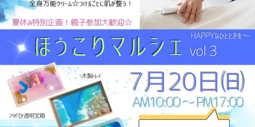 7月20日(日)AM10時〜PM17時 2階テナント「とり樹亭」にて開催 「ほっこりマルシェvol3」 夏の思い出に☆ご家族みんなで楽しめるアットホームでほっこり温まるイベントに遊びにいらしてください😊 ◇…